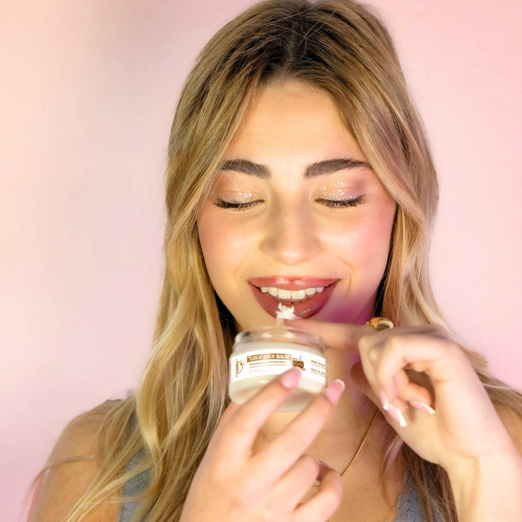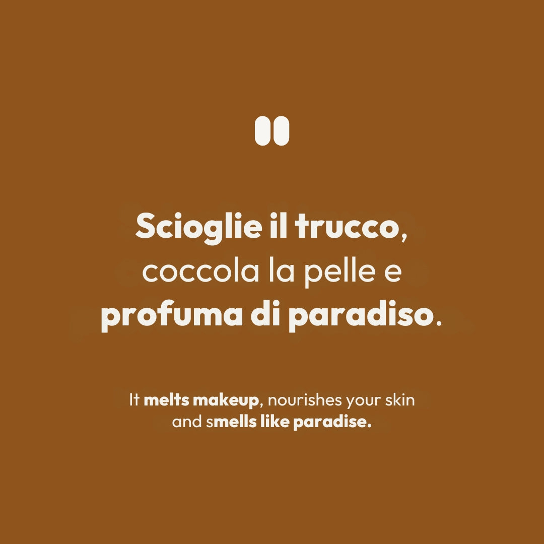 Sono il balsamo struccante e detergente che solo una “loca” non userebbe! Ispirato al paradiso caraibico di Cayo Coco, sciolgo letteralmente tutto il trucco (anche quello di Halloween) e le impurità grasse, lasciandoti una pelle fresca e pulita, con un naturale e delicato profumo di cocco tropicale. Sono adatto a tutti i tipi di pelle anche le più sensibili, non brucio gli occhi e ti lascio una sensazione di idratazione e morbidezza. Insieme alla Mousse detergente micellare, formo la famosa doppia-detersione.